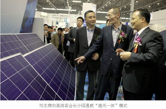 開幕式結(jié)束后,高鴻賓會長等一行領(lǐng)導在劉主席的陪同下到通威展臺參觀,劉主席向高會長詳細地介紹了通威“漁光一體”創(chuàng)新模式。通威“漁光一體”項目以光伏發(fā)電站為主,漁業(yè)養(yǎng)殖為輔,結(jié)合通威365健康養(yǎng)殖模式,拓展了通威太陽能光伏技術(shù)應用領(lǐng)域,通過“水上產(chǎn)出清潔能源、水下生產(chǎn)安全通威魚”,達到光伏發(fā)電與漁業(yè)養(yǎng)殖的一體化有機結(jié)合,實現(xiàn)了“魚、電、環(huán)保”三豐收。