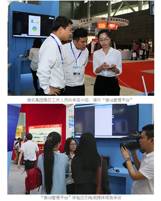 為充分體現(xiàn)集團“互聯(lián)網(wǎng)”+“農業(yè)”的豐碩成果,集團在展區(qū)設計上巧妙地將大紅色調元素的飼料及動保產(chǎn)品展示區(qū)、LED大屏幕與天藍色調元素的“豬OK管理平臺”演示區(qū)融為一體。來賓們在參觀了解飼料、動保產(chǎn)品,并通過正面LED大屏幕觀看全新制作的“豬OK平臺”三維動漫宣傳片后,即可繞到背面的“豬OK平臺”演示區(qū),通過手機APP多媒體桌面展示技術,樂享“豬OK平臺”便捷的操作體驗及豬場管理“豬事OK”的神奇魅力。