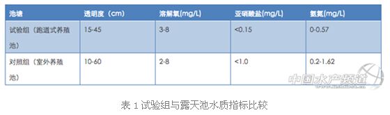 (1)、水質(zhì)狀況選取2個(gè)對(duì)照組池塘,面積分別為10畝和15畝,均為室外養(yǎng)殖池,在3個(gè)月時(shí)間內(nèi)與試驗(yàn)池進(jìn)行水質(zhì)比較,進(jìn)行透明度、氨氮、亞硝酸鹽等指標(biāo)的測(cè)試與對(duì)比,結(jié)果見表1。