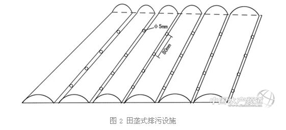 該設(shè)施因形狀像整理好的田壟而得名(見圖2),壟頂與壟底高度差是4cm,每個(gè)壟之間的距離為70cm,在田壟溝里有已經(jīng)鋪好了用聚氯乙烯材料制作的管道,管道的上方打滿了小孔,小孔孔徑5mm,孔與孔間距為8-10cm,這些管道打好孔之后半埋在田壟溝里,田壟溝里的所有排污管與養(yǎng)蝦池一端的排水溝都是相通的,在水流的帶動(dòng)下殘餌糞便等雜物會(huì)在池底逐漸聚集在一起,當(dāng)打開排污的閥門時(shí),蝦池里的殘餌和糞便便會(huì)在水壓的作用下進(jìn)入管道并通過管道流出流水溝,從而保持水質(zhì)的清潔。