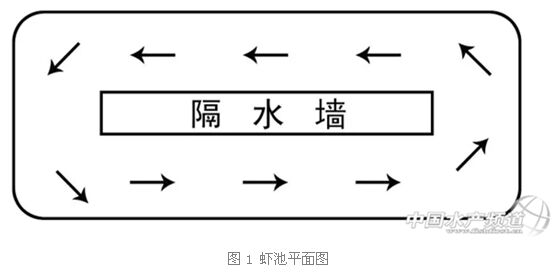 在蝦池中間加道隔水墻,隔水墻和池壁之間留有空隙,這樣在進(jìn)水或充氧時(shí)蝦池里的水就會(huì)圍著隔水墻轉(zhuǎn)起來,靜水變成了流動(dòng)的水,由于流水的狀態(tài)像田徑跑道的樣子故得名“跑道式蝦池”(見圖1)。隔水墻從頂部到池底距離大約2m左右,隔水墻頂部寬度0.4m左右,平時(shí)隔水墻是飼養(yǎng)員通行和檢查的通道,隔水池的兩端和池壁不是連在一起,間隔距離2m左右,兩端間隔的作用就是讓池水動(dòng)起來。