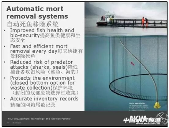 挪威AKVA集團(tuán)亞洲區(qū)總監(jiān)Bj?rn Karlsen有著30年以上在水產(chǎn)養(yǎng)殖業(yè)各大供應(yīng)商工作的豐富經(jīng)驗(yàn),對(duì)于網(wǎng)箱養(yǎng)殖的設(shè)計(jì)和原理非常熟悉。在本次會(huì)議上,他向與會(huì)人員介紹了挪威AKVA集團(tuán)新設(shè)計(jì)的“生態(tài)網(wǎng)箱”(PET)。這個(gè)生態(tài)網(wǎng)箱能夠更好地應(yīng)對(duì)風(fēng)暴和惡劣氣候,網(wǎng)箱帶有自動(dòng)死魚移除系統(tǒng),只需人工操作將沉到底部的死魚和排泄物通過(guò)管道吸入駁船,可以放在水里15年不需要拿出來(lái)!