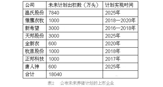 2015年是國內(nèi)最近一輪養(yǎng)豬周期的上行反彈階段,國內(nèi)生豬存欄頭數(shù)已經(jīng)連續(xù)3年下降,2015年生豬存欄頭數(shù)已經(jīng)降到了2008年以來的最低水平,國內(nèi)豬價(jià)在2015年也出現(xiàn)了長時(shí)間上漲,并由此觸發(fā)了新一輪對養(yǎng)豬業(yè)投資發(fā)展的熱潮。但相比過去,本輪養(yǎng)豬的新增投資多為大型企業(yè)主導(dǎo),主要目的在于通過規(guī)?;潭雀?、管理更加精細(xì)的高效養(yǎng)殖方式,在行業(yè)轉(zhuǎn)型期搶占市場份額。眾多上市企業(yè)做出生豬養(yǎng)殖中長期規(guī)劃,10年后上市企業(yè)生豬出欄量將達(dá)到18040萬頭,占到全國出欄量的23.01%。