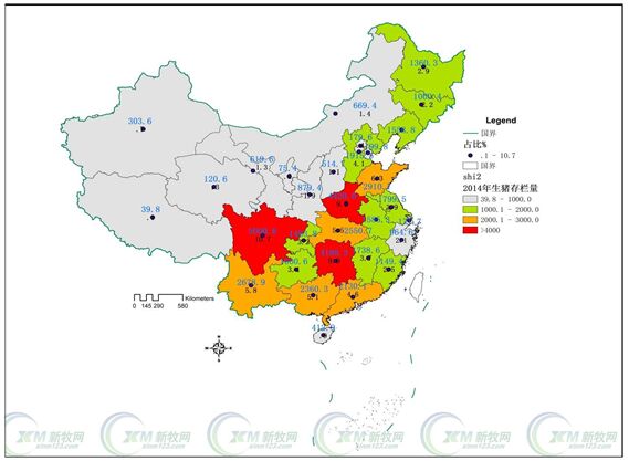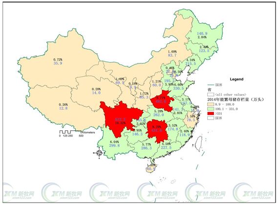 全國各省份能繁母豬存欄示意圖,可以看到,能繁母豬基本上集中在三個大省,四川、河南、湖南。
