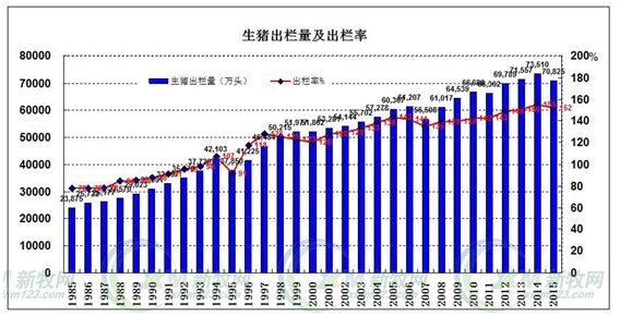 30年,生豬出欄量增長5000萬頭 30年來,生豬存欄緩慢增長,2012年最高峰達到了4.76億頭。從2012年以后開始逐年下降,到2015年4.51億頭,下降了5.2%。生豬出欄量和生豬產量、肉類的情況非常接近,2014年達到最高73510萬頭,2015年有所下降,下降下降3.7%,只剩下70825萬頭。