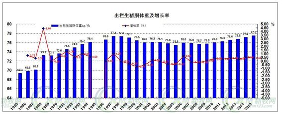另外,生豬胴體重變化比較平穩(wěn)。1985年生豬酮體重是69.3kg,隨后幾年快速上升??赡芘c90年代開始大量從國外引種,逐步向外三元豬轉化有關。近10年,胴體重變化差距不大,2015年只上升了0.1公斤,大體在77.5kg/頭左右。張廣安還表示,由于各地對于胴體標準不太一樣,豬頸部是否計算,還沒有明確的標準,因此數(shù)據(jù)可能有一定差異。