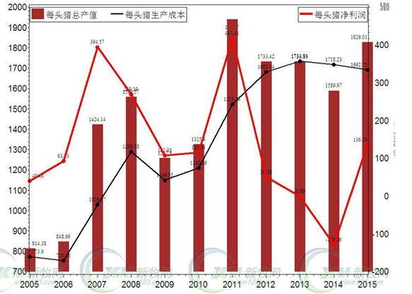 最近10年(2005年-2015年)生豬生產成本和利潤,2012年以前是快速上升,2012年以后穩(wěn)定在1700元/頭左右。張廣安介紹說,但是利潤跌蕩很大,尤其是2014年,跌到了最低點虧損100元左右,2015年才開始回升。養(yǎng)豬成本則是整體上升趨勢。
