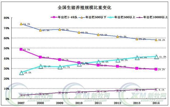 近十年,大規(guī)模豬場激增,小散退養(yǎng)近一半 近十年(2005年-2014年),豬場規(guī)模變化巨大。據(jù)張廣安介紹,3000-9000頭規(guī)模迅速增長,從2005年的5094萬戶增長到2014年的20975萬戶。而50-99頭以下規(guī)模,從2012年開始逐年減少,從2012年最高峰173萬戶,下降到2014年157萬戶。這也說明,散戶正在逐漸撤離,大規(guī)模豬場在快速擴張。