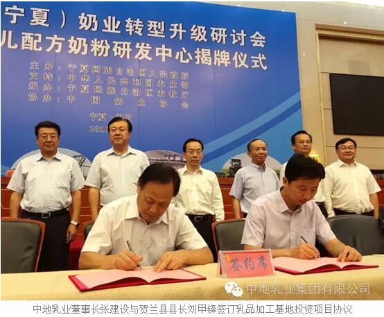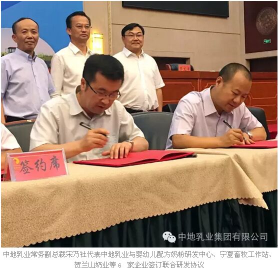 揭牌儀式后,賀蘭縣政府與中地乳業(yè)簽訂嬰幼兒配方奶粉加工項目協議,嬰幼兒配方奶粉研發(fā)中心與中地乳業(yè)、寧夏畜牧工作站、賀蘭山奶業(yè)、金河乳業(yè)、夏進乳業(yè)、恒大乳業(yè)簽訂嬰幼兒配方奶粉聯合研發(fā)協議。