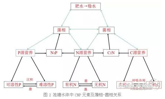 池塘水體中,主要的營養(yǎng)元素有碳、氮、磷、鉀及礦物質元素這5大類。其中,水體N、P比決定著水體藻相的變化,重點體現(xiàn)了池塘水體的肥度和肥水效果;而C、N比則決定著池塘水體菌相的變化,重點體現(xiàn)了池塘水體的“穩(wěn)度”和水體穩(wěn)定效果。只有在池塘水體“菌相-藻相”互相平衡的時候,池塘水體才能夠保持較好的穩(wěn)定性。