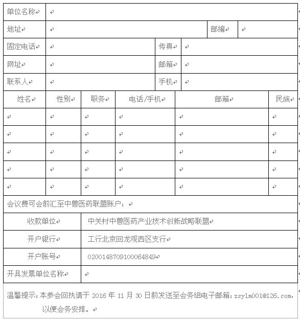3.盟員單位參會人員至少1人必須是企業(yè)負(fù)責(zé)人。參會回執(zhí)請于2016年11月30日前發(fā)送至?xí)?wù)組郵箱:zsylm001@126.com
