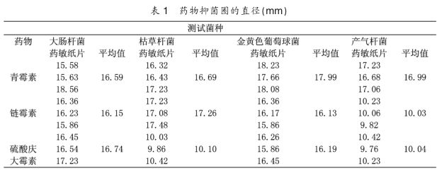 濾紙片的制備及處理。將普通定性濾紙用打孔機打成若干圓形紙片,直徑為5.0mm,置于干燥潔凈的試管內,塞上棉塞,放入高壓滅菌鍋中經(121℃,20分鐘)高壓滅菌后,取出放入恒溫干燥箱內進行干燥。取一定數(shù)量紙片,分別放入100單位/mL 的各種藥物中,浸潤后備用。接種培養(yǎng)。分別取上述菌株的新鮮培養(yǎng)物,在無菌操作條件下,用不同涂布棒均勻涂抹在接種過不同菌種的瓊脂培養(yǎng)基上,再用無菌鑷子,將在藥液中浸潤的紙片均勻間隔貼于各培養(yǎng)基表面,再用無菌吸管在接種過不同菌種的培養(yǎng)基上打孔,將藥液用移液槍移入孔內,各藥液對每種試驗菌均做3個重復。貼入時標記起始位置,按順時針或逆時針方向將濾紙片順序貼入,輕壓紙片使接觸良好。放入37℃恒溫培養(yǎng)箱中,24小時后取出,觀察抑菌圈,測量并記錄結果,取抑菌圈直徑平均值。抑菌圈直徑測量參照《微生物和檢驗技術》判定結果,用抑菌圈的直徑表示,抑菌圈越大,抑菌效果越好。