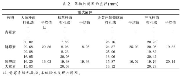 藥敏紙片法是最常用的一種試驗方法,能直接體現(xiàn)出抗菌藥物的抗菌效用。其優(yōu)點是直觀明顯、對比鮮明,有一定的實驗依據。打孔法僅用1個打孔器,省去了數(shù)量較多的紙片和藥物的浪費。由于液體的表面張力作用,孔中液體在較低斜度下不會外流,能獲得理想的圓形抑菌圈。