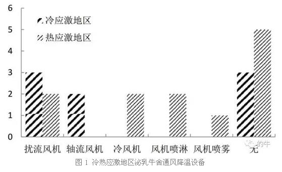 奶牛耐熱性差,牛舍中常利用通風(fēng)降溫設(shè)備調(diào)節(jié)舍內(nèi)環(huán)境。冷熱應(yīng)激區(qū)域泌乳牛舍的降溫通風(fēng)設(shè)備使用狀況見(jiàn)圖1。