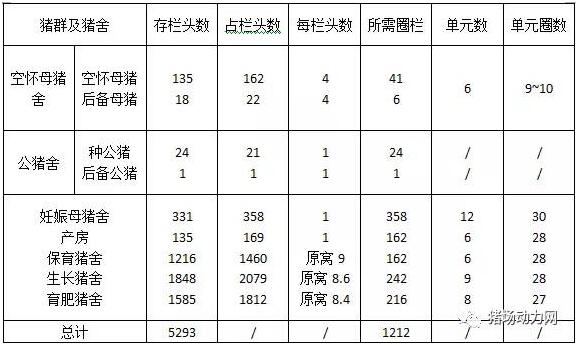 通過以上計(jì)算方法,我們即可以合理的計(jì)算出一個(gè)豬場的豬群結(jié)構(gòu)組成已經(jīng)圈欄設(shè)置。下表是以600頭基礎(chǔ)母豬為例計(jì)算出的豬群結(jié)構(gòu)組成以及豬舍和圈欄設(shè)置。