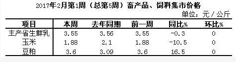 據(jù)對(duì)全國500個(gè)集貿(mào)市場(chǎng)的定點(diǎn)監(jiān)測(cè),2月份第1周(采集日為2月3日)生鮮乳、玉米價(jià)格持平。