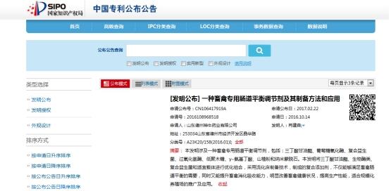 2017年2月22日,公司產品“常溢金”以其獨有的理念和奇特的組方,被國家知識產權局予以受理并公布。專利名稱為“一種畜禽腸道平衡調節(jié)劑及其制備方法和應用”,本發(fā)明將三丁酸甘油酯、生物酶類、復合益生菌和適宜載體進行優(yōu)化組合,采用流化床制備技術制成復合添加劑,不僅能夠滿足畜禽腸道平衡的需要,同時又能提升畜禽消化吸收能力,明顯改善畜禽健康狀況,提高生產性能,適合規(guī)?;B(yǎng)殖場的推廣及應用。