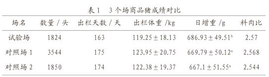 跟蹤三個(gè)試驗(yàn)場(chǎng)數(shù)據(jù),并統(tǒng)計(jì)分析可以得出:試驗(yàn)場(chǎng)一共追蹤1824頭商品豬生長(zhǎng)性能成績(jī),比對(duì)場(chǎng)分別追蹤3544頭、1850頭商品豬生長(zhǎng)性能成績(jī),對(duì)比發(fā)現(xiàn)料肉比沒(méi)有明顯差異;試驗(yàn)場(chǎng)日增重顯著高于其他兩個(gè)對(duì)比場(chǎng)(P<0.05);在飼養(yǎng)出欄天數(shù)少11-12天的情況下,出欄體重僅僅低4kg左右(表1)。由此可見(jiàn),優(yōu)秀公豬豬精配種后代的生長(zhǎng)速度明顯高于對(duì)比場(chǎng)。在出欄體重(120kg)相同的情況下可降低出欄天數(shù)5-6天。因此采用優(yōu)秀種公豬配種可快速改善后代生長(zhǎng)性能,提高生長(zhǎng)速度,由此可降低出欄天數(shù),節(jié)約生產(chǎn)成本,為養(yǎng)殖場(chǎng)創(chuàng)造巨大的經(jīng)濟(jì)效益。