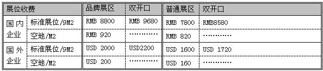 注:1.標(biāo)準(zhǔn)展位包括地毯、三面圍板、公司名稱楣板、咨詢桌一張、折椅兩把、射燈兩盞、電源插座一個(特殊用電請事先說明,另行收費)。