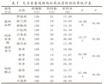 (3)調(diào)查方法。調(diào)查無為縣三家主要蛋雞養(yǎng)殖企業(yè)蛋雞在蛋雞品種、飼養(yǎng)水來源、發(fā)病季節(jié)、飼養(yǎng)模式中的雞白痢血清檢測陽性率分布特征。采用spss20.0統(tǒng)計學(xué)軟件分析數(shù)據(jù)資料,若P<0.05,則表示組間比較具有顯著差異性。