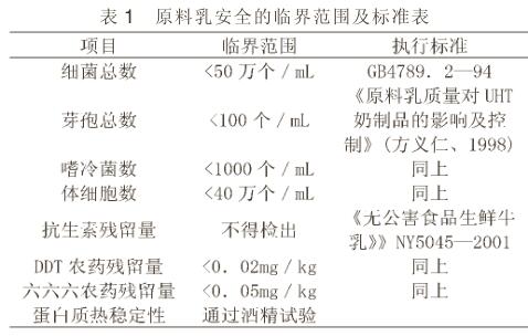 (3)建立關(guān)鍵控制點(diǎn)的臨界范圍。符合原料乳安全的臨界范圍和標(biāo)準(zhǔn)可以來源于相關(guān)的標(biāo)準(zhǔn)和準(zhǔn)則、有關(guān)文獻(xiàn)、實(shí)驗(yàn)結(jié)果以及專家的建議。臨界范圍可以建立在溫度、濕度、時(shí)間、有效氯和微生物等因素上。原料乳安全的臨界范圍和標(biāo)準(zhǔn)參照見表1。