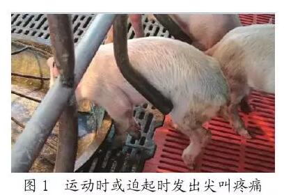 發(fā)病迅速,感染病原后幾天內(nèi)就發(fā)病。出現(xiàn)體溫高、反應(yīng)遲鈍,運(yùn)動(dòng)時(shí)或迫起時(shí)發(fā)出尖叫疼痛(見(jiàn)圖1),某些豬由于發(fā)生腦膜炎而表現(xiàn)肌肉震顫、麻痹、驚厥。病豬四肢關(guān)節(jié)腫大,跛行,顫抖,共濟(jì)失調(diào),可視黏膜發(fā)紺,眼睛灰色或褐色,個(gè)別有眼球突出,而后漸行性消瘦(見(jiàn)圖2),最后死亡,從發(fā)病到死亡時(shí)間較長(zhǎng)。