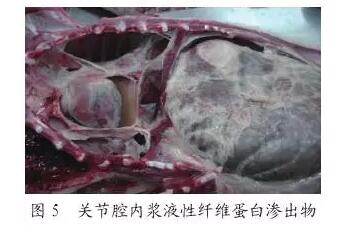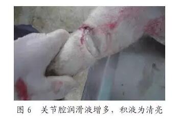 引起的關(guān)節(jié)炎、跗(見(jiàn)圖4),腕關(guān)節(jié)腫大、劇痛、瘸腿,用手一捏,疼得尖叫;剖檢關(guān)節(jié)腔內(nèi)有漿液性纖維蛋白滲出物(圖5),關(guān)節(jié)腔潤(rùn)滑液增多,積液為清亮或微黃(圖6),關(guān)節(jié)腫大一般是對(duì)稱(chēng)性的,而鏈球菌則不一定。