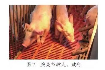 關(guān)節(jié)型鏈球菌腕關(guān)節(jié)發(fā)病居多(圖7),關(guān)節(jié)腔積液是化膿型,比較濃稠,色澤深。關(guān)節(jié)腫大,初期堅(jiān)硬、溫度升高,后期變軟,觸之有波動(dòng)感,針刺流膿,有時(shí)傷口破潰后膿汁會(huì)自動(dòng)流出;少數(shù)變硬、皮膚增厚;剖檢滑液渾濁,有黃白色奶酪樣塊狀物,關(guān)節(jié)周?chē)は履z樣水腫,有化膿性壞死灶,嚴(yán)重者關(guān)節(jié)軟骨壞死。