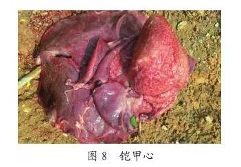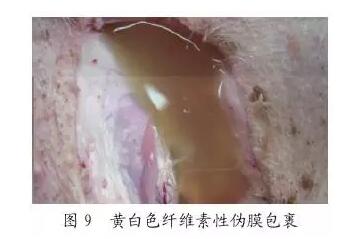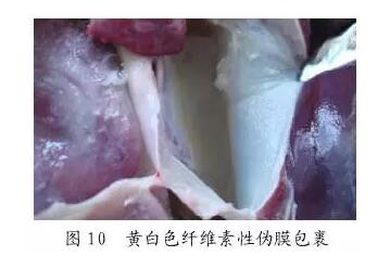 腹腔有明顯的纖維素性滲出,常出現(xiàn)腹腔臟器與腹膜粘連,嚴(yán)重的剖開(kāi)腹腔后看不見(jiàn)腹腔臟器,整個(gè)腹腔勝器被黃白色纖維素性偽膜包裹(見(jiàn)圖9、圖10),并且腹水嚴(yán)重,伴發(fā)怪臭味。