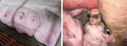 溫度過高,哺乳仔豬額頭出現(xiàn)污漬、母豬乳房出現(xiàn)黑圈