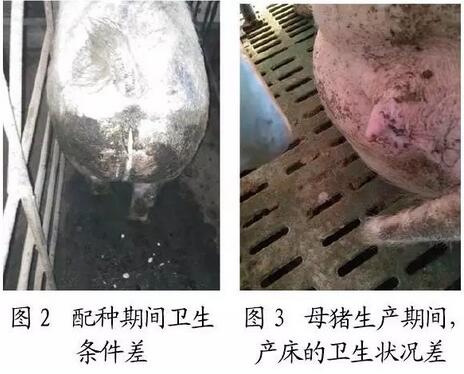 1、夏季高溫高濕,環(huán)境衛(wèi)生很容易變差,導(dǎo)致病原微生物大量繁殖,污染母豬陰戶(hù)開(kāi)張時(shí)期(在產(chǎn)、發(fā)情、配種)的外陰和產(chǎn)道,有害細(xì)菌進(jìn)入子宮內(nèi)進(jìn)行繁殖而導(dǎo)致子宮炎的發(fā)生。圖2為配種期間的衛(wèi)生狀況差。圖3為母豬生產(chǎn)期間,產(chǎn)床的衛(wèi)生狀況差。