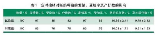 試驗(yàn)組斷奶母豬斷奶24h后肌注促性素(PMSG),再過72h肌注生源(GnRH),肌注GnRH 24h進(jìn)行輸精1次,過24h再輸精1次;對照組斷奶母豬發(fā)情就開始輸精,過24h再輸精1次(如還發(fā)情,第2次輸精過24h后再輸精1次);精液劑量都為80mL(2×109個(gè)精子細(xì)胞)。