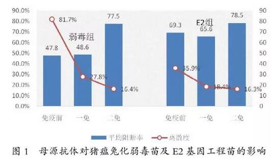 近年來(lái),新型疫苗研究顯示,DNA疫苗、重組基因苗、亞單位苗等具有抗母源抗體干擾的特征。為了解天康生物制備的E2重組桿狀病毒試驗(yàn)滅活苗是否具有抗母源抗體干擾性能,本研究將該苗與兔化弱毒苗同時(shí)接種斷奶仔豬,對(duì)比監(jiān)測(cè)母源抗體對(duì)免疫的影響。