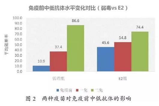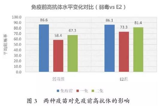 以阻斷率70%作為分界線,低于70%為中低水平,兩種苗在中低水平情況下均能很好的誘導(dǎo)抗體的產(chǎn)生(圖2)。