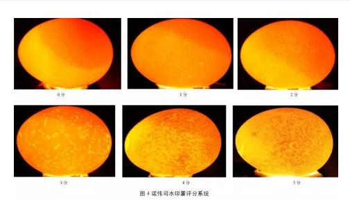 蛋雞剛產(chǎn)出的蛋并沒有水印,水印蛋是在雞蛋進(jìn)入到市場(chǎng)之后的3~5d才逐漸出現(xiàn)的。因此需要找到一個(gè)能夠量化水印蛋嚴(yán)重程度的方法。諾偉司國(guó)際公司技術(shù)部通過對(duì)水印蛋的結(jié)構(gòu)研究發(fā)現(xiàn),所有出現(xiàn)水印的雞蛋,在照蛋器下都可以看到透光的斑點(diǎn)(圖2),通過近240個(gè)水印蛋的照蛋分析發(fā)現(xiàn),只要有暗斑的部位在照蛋器下的透光面積就大,小點(diǎn)狀的亮斑在蛋殼上沒有暗斑。水印蛋的暗斑和照蛋器下的亮斑成100%的相關(guān)性。基于以上基礎(chǔ),諾偉司技術(shù)部構(gòu)建了水印蛋蛋殼評(píng)分系統(tǒng)(圖4)。