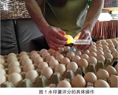 每天觀察2次,記錄任何不正常的現(xiàn)象,統(tǒng)計(jì)產(chǎn)蛋率、死亡率、發(fā)病率、跛腳率、羽毛背禿率、啄羽、啄肛及脫肛等情況。統(tǒng)計(jì)每天各重復(fù)試驗(yàn)雞蛋中無殼蛋、破殼蛋(包括裂紋蛋)、軟殼蛋及畸形蛋發(fā)生數(shù)量,計(jì)算百分比。非正常雞及時(shí)從試驗(yàn)群中剔除。按重量數(shù)記錄用于每重復(fù)的飼料供應(yīng)量。根據(jù)料槽中剩料量、已記錄的料袋中的剩余量,計(jì)算飼料剩余量。計(jì)算每天產(chǎn)蛋率、日產(chǎn)蛋重及蛋重(按重復(fù)數(shù)),并計(jì)算料蛋比。在試驗(yàn)第4周,分別從每個(gè)處理的每個(gè)重復(fù)隨機(jī)選取15枚雞蛋,用于測(cè)定蛋殼強(qiáng)度和蛋殼厚度;從每個(gè)重復(fù)隨機(jī)抽取30枚雞蛋,用手機(jī)手電筒照蛋(圖5),由3個(gè)操作人員同時(shí)用諾偉司水印蛋評(píng)分系統(tǒng)評(píng)定水印蛋的嚴(yán)重程度。