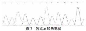 圖1以紅、藍、綠線的峰來通過單雙峰或套疊峰來判斷基因是否突變,綿羊FecB從編碼249位的谷氨酰胺(Q)突變成了精氨酸(R),即CAG突變成CGG,CGG即為突變后的精氨酸。通過基因比對,發(fā)現(xiàn)其發(fā)生突變,為純合子。