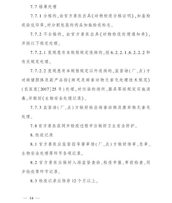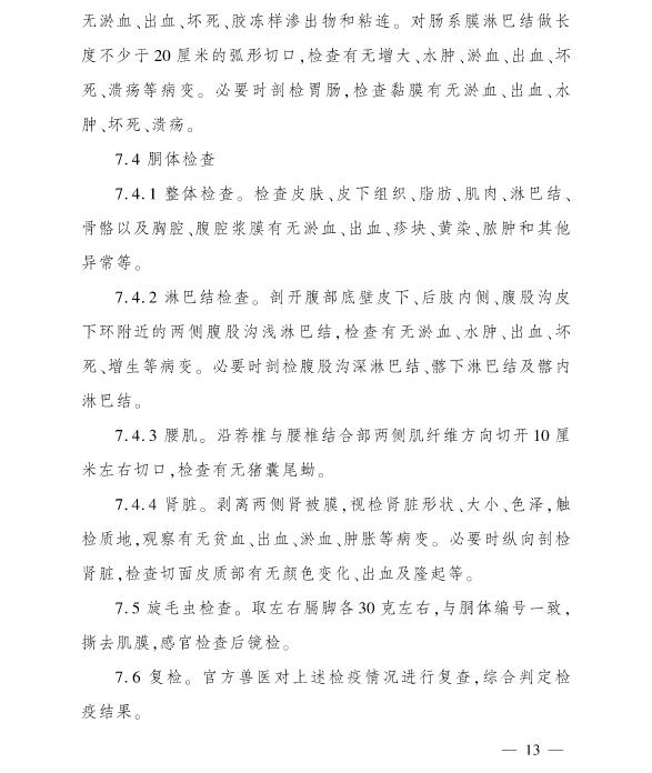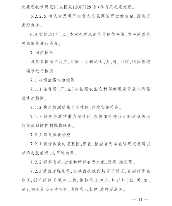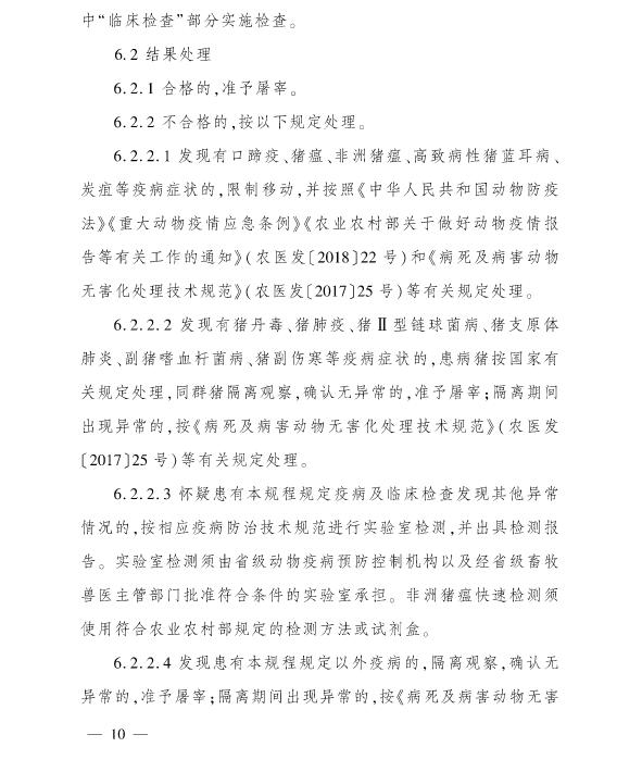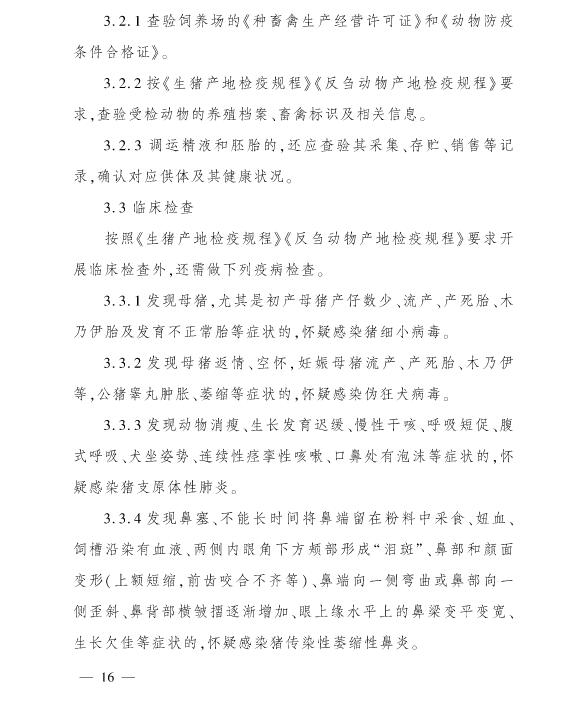 為進一步強化非洲豬瘟防控工作,切實落實國務院關于禁止用餐廚剩余物飼喂生豬等有關要求,規(guī)范實施生豬及生豬產(chǎn)品檢疫工作,我部對《生豬產(chǎn)地檢疫規(guī)程》《生豬屠宰檢疫規(guī)程》和《跨省調(diào)運乳用種用動物產(chǎn)地檢疫規(guī)程》進行了修訂。非洲豬瘟應急響應期間,農(nóng)業(yè)農(nóng)村部對檢疫工作另有規(guī)定的,從其規(guī)定執(zhí)行。各地要高度重視生豬及生豬產(chǎn)品檢疫工作,探索并逐步建立檢測出證制度,不斷提升檢疫工作水平。要確保動物及動物產(chǎn)品檢疫隊伍穩(wěn)定,人員充足,專人專崗,切實有效履行檢疫職責。