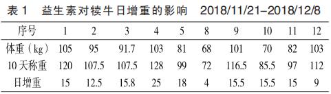 (2)從犢牛斷奶當(dāng)天開(kāi)始使用益生素,從斷奶4~6月齡開(kāi)始轉(zhuǎn)場(chǎng)進(jìn)入育肥階段,這60天飼喂益生素組犢牛比單純飼喂健胃散組犢牛每頭每天多增長(zhǎng)0.097kg。