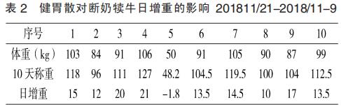 通過(guò)對(duì)斷奶后選出的20頭瘦、弱、病犢牛的跟蹤治療以及添加益生素、健胃散,并分析對(duì)比20頭斷奶犢牛隨機(jī)分成2組,每組10頭進(jìn)行飼料拌DIA提高犢牛免疫力和日增重,降低犢牛斷奶應(yīng)激引起呼吸道疾病及體重減輕等現(xiàn)象,在實(shí)驗(yàn)過(guò)程中有1頭由于發(fā)病參與治療。從數(shù)據(jù)得出,18天10頭犢???cè)赵鲋?45.3kg,平均18天日增重0.807kg(見(jiàn)表1)。