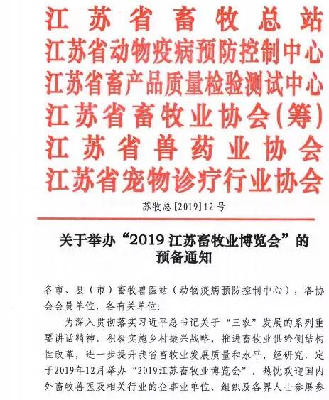 江蘇是全國農(nóng)區(qū)畜牧業(yè)大省,畜牧產(chǎn)業(yè)基礎(chǔ)雄厚,蘊(yùn)含著廣闊的發(fā)展前景和市場商機(jī)。為了進(jìn)一步推動(dòng)江蘇省畜牧業(yè)現(xiàn)代化發(fā)展與對(duì)外交流,加大畜牧業(yè)新技術(shù)、新成果、新產(chǎn)品的宣傳推廣,為廣大生產(chǎn)商和國內(nèi)外專業(yè)人士、經(jīng)銷商、養(yǎng)殖大戶提供一次絕佳的信息交流及貿(mào)易洽談機(jī)會(huì),并通過本次展覽會(huì)相互溝通信息、交流經(jīng)驗(yàn)、加強(qiáng)合作、共同發(fā)展,同時(shí),為充分發(fā)揮畜牧行業(yè)在我國農(nóng)村經(jīng)濟(jì)、農(nóng)民增收、農(nóng)業(yè)增產(chǎn)中的作用,由相關(guān)主管部門決定,擬定于2019年12月10日-12日,在南京國際會(huì)展中心舉辦“2019華東地區(qū)畜牧業(yè)博覽會(huì)暨2019第四屆江蘇畜牧業(yè)博覽會(huì)”, 屆時(shí),將有來自全國各地的畜牧企業(yè)、養(yǎng)殖場、經(jīng)銷商、代理商及廣大養(yǎng)殖戶齊聚南京,共同打造江蘇省現(xiàn)代畜牧業(yè)博覽會(huì)這一專業(yè)盛會(huì)!