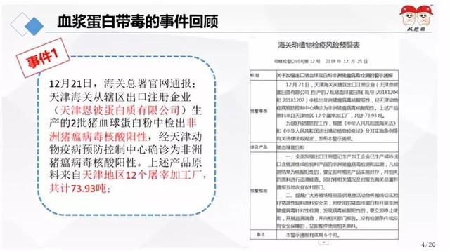 事件2:2018年12月21日,海關(guān)總署官網(wǎng)通報(bào):天津海關(guān)從轄區(qū)出口注冊(cè)企業(yè)(天津恩彼蛋白質(zhì)有限公司)生產(chǎn)的2批豬血球蛋白粉中檢出非洲豬瘟病毒核酸陽性,經(jīng)天津動(dòng)物疫病預(yù)防控制中心確診為非洲豬瘟病毒核酸陽性。上述產(chǎn)品原料來自天津地區(qū)12個(gè)屠宰加工廠,共計(jì)73.93噸。