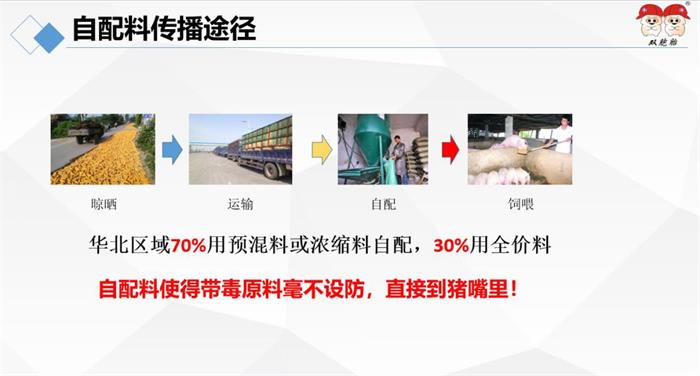 華北區(qū)域70%用預(yù)混料或濃縮料自配,30%用全價(jià)料,玉米沒有經(jīng)過高溫?zé)o法殺死病毒,自配料使得帶毒原料毫不設(shè)防,直接到豬嘴里,感染非瘟的幾率極大。