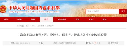農(nóng)業(yè)農(nóng)村部新聞辦公室4月21日發(fā)布,海南省??谑行阌^(qū)、澄邁縣、保亭黎族苗族自治縣、陵水黎族自治縣發(fā)生非洲豬瘟疫情。
