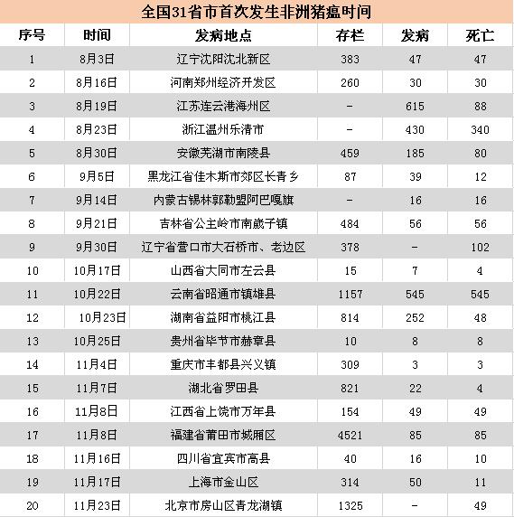 截至目前,全國除了港澳臺以外的31個省區(qū)市已經(jīng)全部發(fā)現(xiàn)非洲豬瘟疫情。