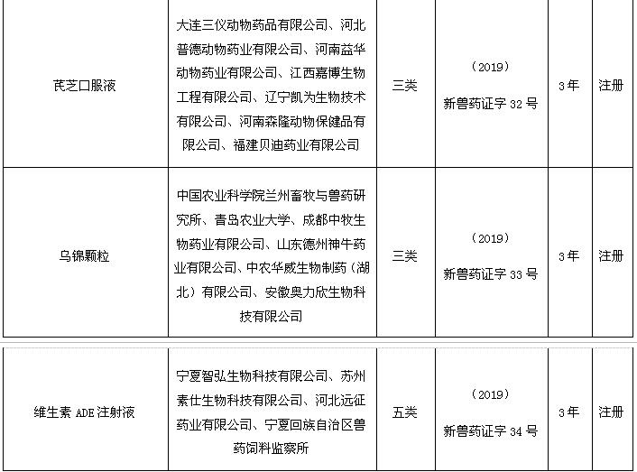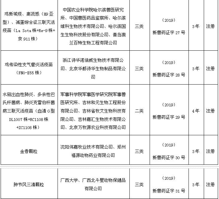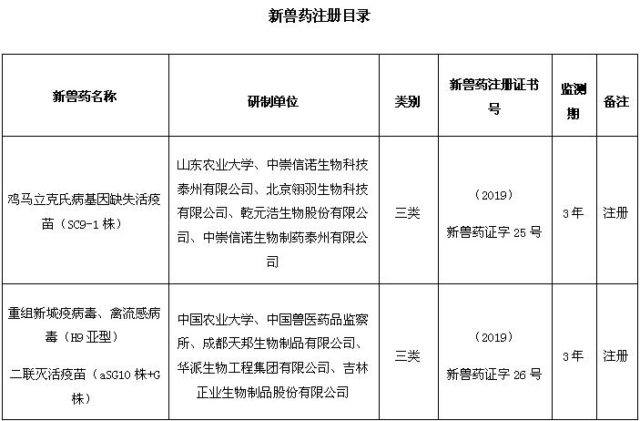 根據(jù)《獸藥管理?xiàng)l例》和《獸藥注冊(cè)辦法》規(guī)定,經(jīng)審查,批準(zhǔn)山東農(nóng)業(yè)大學(xué)等42家單位申報(bào)的雞馬立克氏病基因缺失活疫苗(SC9-1株)等10種獸藥產(chǎn)品為新獸藥,核發(fā)《新獸藥注冊(cè)證書(shū)》,發(fā)布產(chǎn)品試行規(guī)程、質(zhì)量標(biāo)準(zhǔn)、說(shuō)明書(shū)和標(biāo)簽,自發(fā)布之日起執(zhí)行。