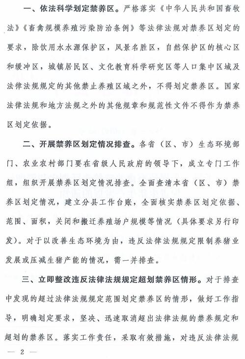 通知指出,各地要嚴(yán)格落實(shí)《中華人民共和國畜牧法》《畜禽規(guī)模養(yǎng)殖污染防治條例》等法律法規(guī)對(duì)禁養(yǎng)區(qū)劃定的要求,依法科學(xué)劃定禁養(yǎng)區(qū)。除飲用水水源保護(hù)區(qū),風(fēng)景名勝區(qū),自然保護(hù)區(qū)的核心區(qū)和緩沖區(qū),城鎮(zhèn)居民區(qū)、文化教育科學(xué)研究區(qū)等人口集中區(qū)域及法律法規(guī)規(guī)定的其他禁止養(yǎng)殖區(qū)域之外,不得劃定禁養(yǎng)區(qū)。國家法律法規(guī)和地方法規(guī)之外的其他規(guī)章和規(guī)范性文件不得作為禁養(yǎng)區(qū)劃定依據(jù)。