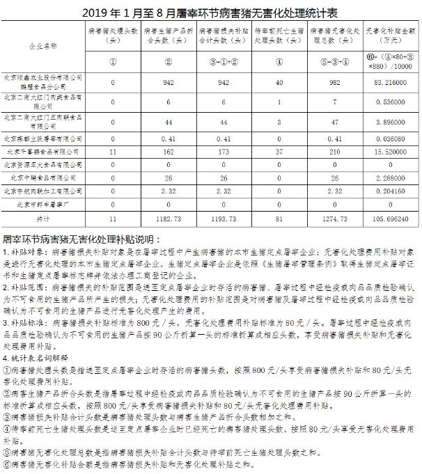 2019年1月至8月,屠宰環(huán)節(jié)病害豬無害化處理補(bǔ)貼資金,經(jīng)屠宰企業(yè)無害化處理統(tǒng)計(jì)上報(bào)、駐場官方獸醫(yī)現(xiàn)場監(jiān)督簽字確認(rèn)、區(qū)動物衛(wèi)生監(jiān)督機(jī)構(gòu)監(jiān)督核查報(bào)送、區(qū)畜牧獸醫(yī)行政主管部門審核驗(yàn)證上報(bào)、市畜牧主管部門整理匯總,根據(jù)《北京市屠宰環(huán)節(jié)病害豬無害化處理補(bǔ)貼資金管理辦法(暫行)》有關(guān)規(guī)定,現(xiàn)將2019年1月至8月各生豬定點(diǎn)屠宰企業(yè)病害豬無害化處理補(bǔ)貼情況予以公示,公示期2019年9月16日至2019年9月22日。