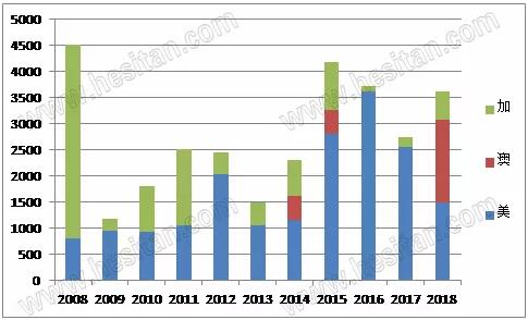 主要國(guó)家對(duì)華出口牛胚胎,2008-2018