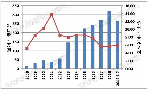 美國(guó)對(duì)華出口牛凍精,2008-2019